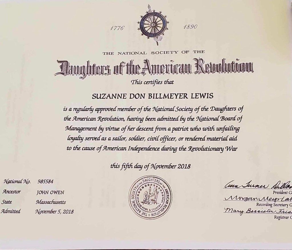 All of that didn’t matter when we finally found the time to start comparing our notes. Two family sides meshed into one. Newly retired, Suzi immersed herself with the combing through of old newspaper articles, census records, letters, birth certificates and military records while I began helping her sift through the endless boxes of old photographs trying to identify our deceased relatives. It was during this time she developed a strong desire to find out the path us sisters would need to be accepted into The Daughters of the American Revolution. Not an easy task but civic pride and participation had always been very important to her.